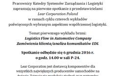 W dniu 6 grudnia odbyło się pierwsze spotkanie z cyklu czterech wykładów z przedstawicielami Lear Corporation o/w Jarosławiu. Temat przewodni to "Logistics Flow in Automotive Company". Organizatorzy: Pracownicy Katedry Systemów Zarządzania i Logistyki (Paulina Bełch, Magdalena Szydełko, Iwona Ślęzak-Gładzik) i SKNL.