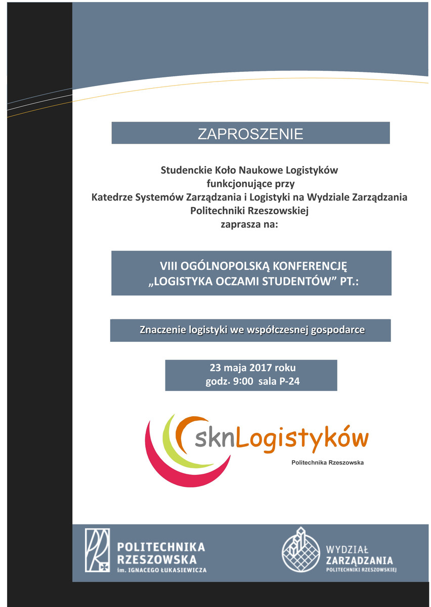 Zaproszenie na VIII Konferencję „Logistyka oczami studentów” pt. Znaczenie logistyki we współczesnej gospodarce - 23 maja 2017 r.